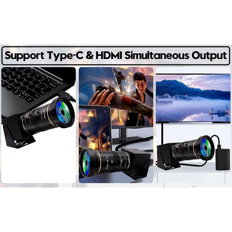 Salidas simultáneas HDMI + USB3.0: Esta cámara HDMI 4K USB ofrece una resolución ultra HD de 3840x2160, con salidas simultáneas HDMI y USB 3.0 para transferencia de datos de alta velocidad de hasta 5 Gbps. Admite tres modos de trabajo: USB, HDMI y modo de salida simultánea USB+HDMI.