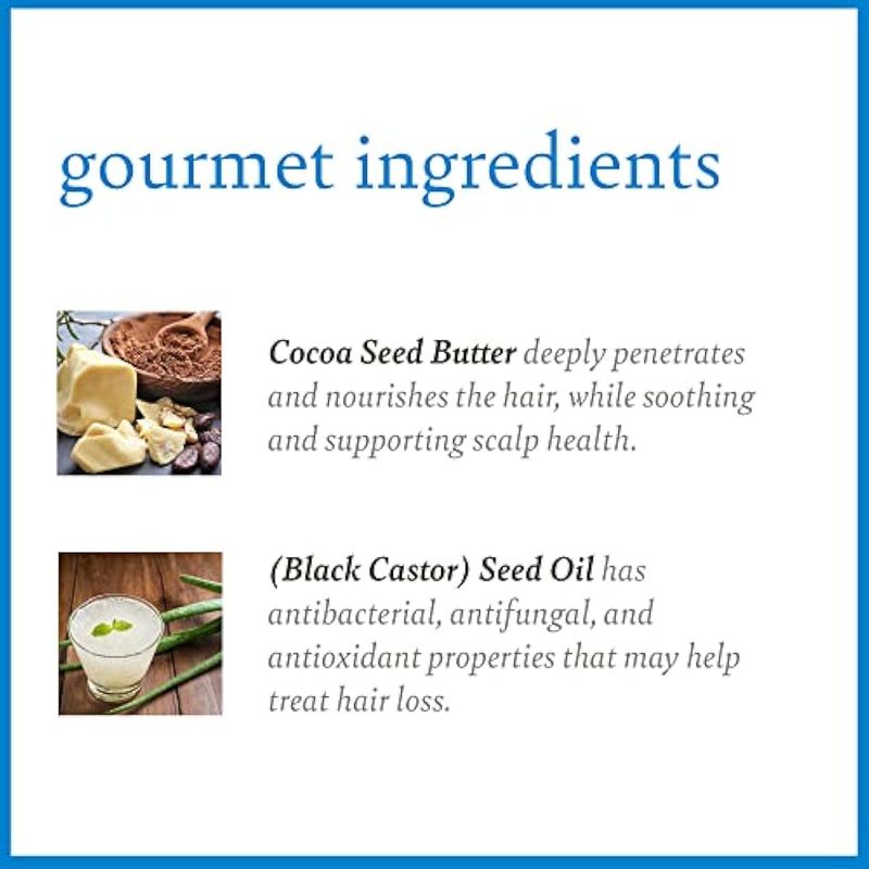 Nutre y brillo: fabricado con mantequilla de semillas de cacao para penetrar y nutrir profundamente las hebras, reduciendo la rotura, el encrespamiento y los vuelos
