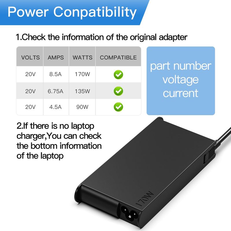 Parámetros del producto: Entrada: 100-240V, 50-60 Hz Salida: 20V 8.5A Potencia nominal: 170W Peso del artículo: 22.93 oz Tamaño del conector: 0.433* 0.197 in