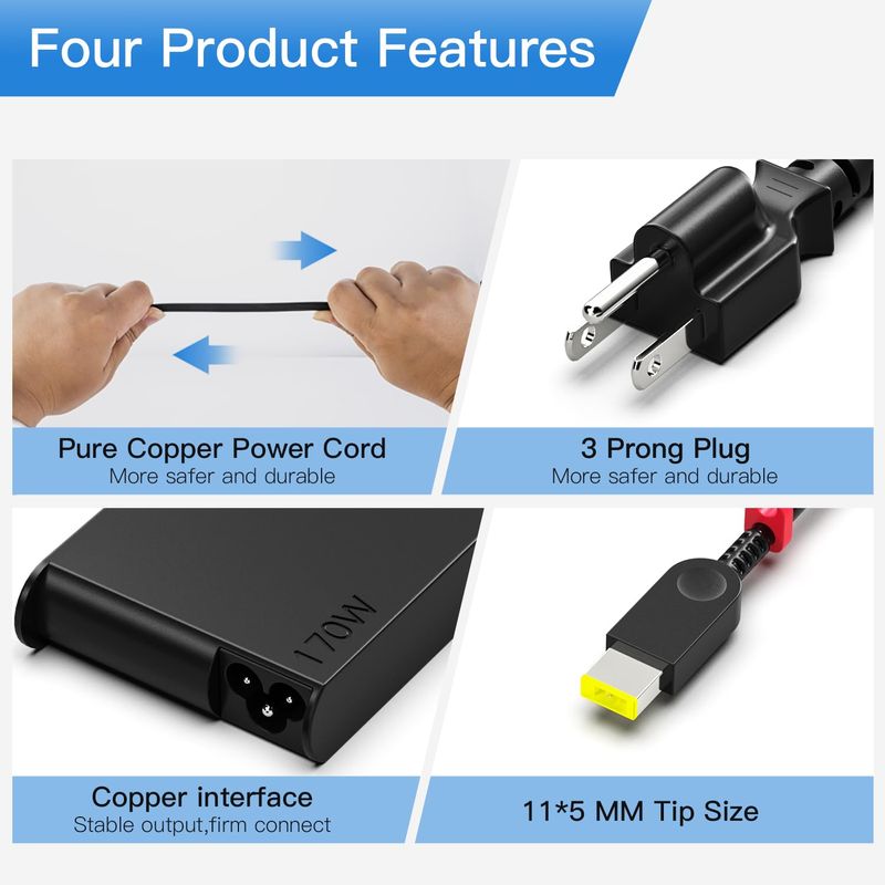 Protección de seguridad múltiplecertificado: probado, cargador adaptador de 170 W protección contra cortocircuitos integrada, protección contra sobretensión, protección contra sobrecalentamiento, etc. Pasó las pruebas CE FCC RoHS. Lo que puede brindarle una experiencia de garantía de seguridad