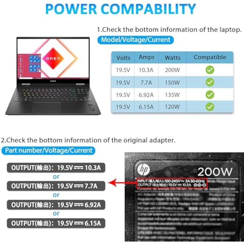Cargador para portátil HP de 200 W, compatible con HP 15 17 15 15t 15u 17 17t 15-ce000 15-dc000 17-an000 15-cx0000, HP Pavilion Gaming 15 16 17 Series, HP OMEN 15 15t, OMEN 17 17 años, Envía Y 15 2020