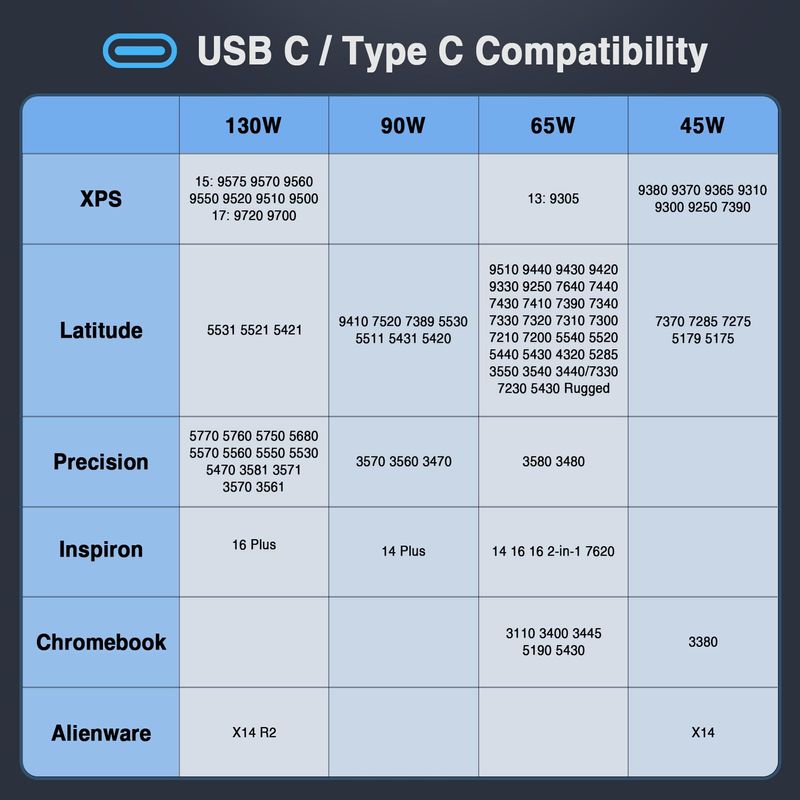 Velocidad de carga rápida: este adaptador de alimentación USB-C de 130 W puede proporcionar carga de alta velocidad y cargará tu Dell XPS 17 9700 de 0 a 50 en solo 30 minutos