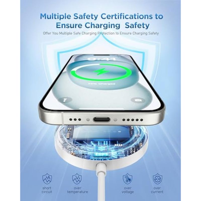 Seguridad superior: el cargador magnético inalámbrico evita que el cargador y tu teléfono se sobrecarguen, sobrecorriente, sobrevoltaje, sobrecalentamiento y cortocircuito. Te proporciona una experiencia de carga mejor y segura. El diseño magnético optimizado hace que la carga sea más fácil, mejorando la conversión de energía y reduciendo el calor mientras se carga.