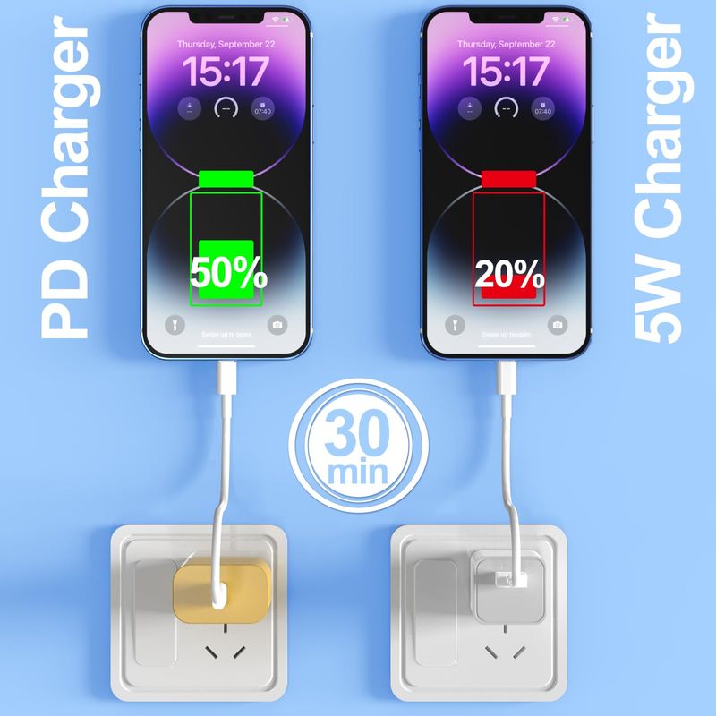 Carga rápida de iPhone 3X: el adaptador rápido PD de puerto USB-C de 20 W y el cable USB C a Lightning de 6 pies, que puede alcanzar hasta 3 veces más rápido que el cargador original de 5 W.