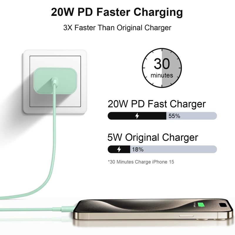 Cargador rápido PD 3.0 de 20 W: cargador rápido PD 3.0 de 20 W y cable USB-C a C de 10 pies, carga el iPhone 16 de 15 a 50 en media hora, que es 3 veces más rápido que con un cargador original de 5 W