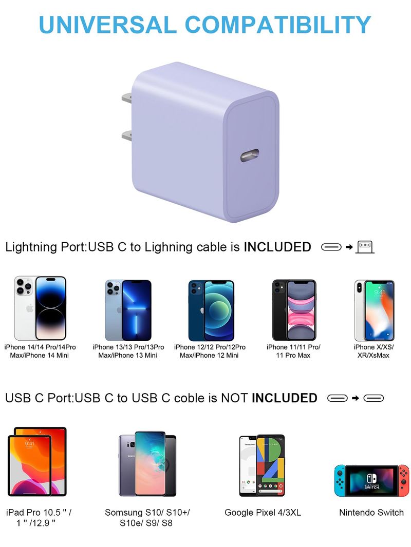 Cargador rápido para iPhone 14 13 12 [certificado MFi] Cargador de pared USB C de 20 W PD con cable