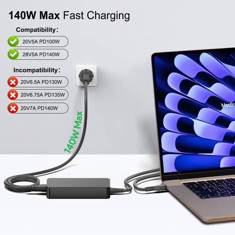 Compatibilidad: repuesto para cargador PD de 140 W, 135 W, 130 W, 100 W, 96 W, 95 W, 87 W, 67 W, 65 W, 61 W, 60 W PD se ajusta a Macbook ProAir Series Microsoft Surface SeriesRazer Blade StealthHPDELL Asus Acer LGMSISamsung y más marcas de portátiles; cargador de portátil HP OMEN Transferencia Cend Laptop 14 -fb0000 RTX 4050 4060 HP Spectre x360 16-aa0000 Ultra 7 RTX 4050 fuente de alimentación. Compatible con portátiles Asus ROG Gaming. Cargador de laptop USB C de repuesto msi 140w compatible con Msi Summit E16 AI Studio Msi Prestige 14 AI Evo Msi Prestige 42 ES44 ES Cable de alimentación AI Studio. Compatible con cargador USB C eero de 140 W eero PoE Gateway c410011. Legion 7i Gen 9 y más.
