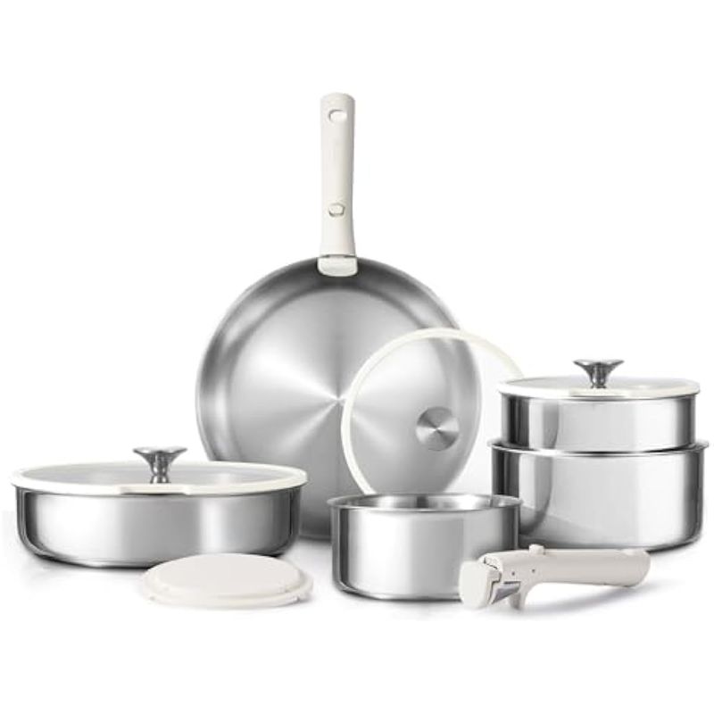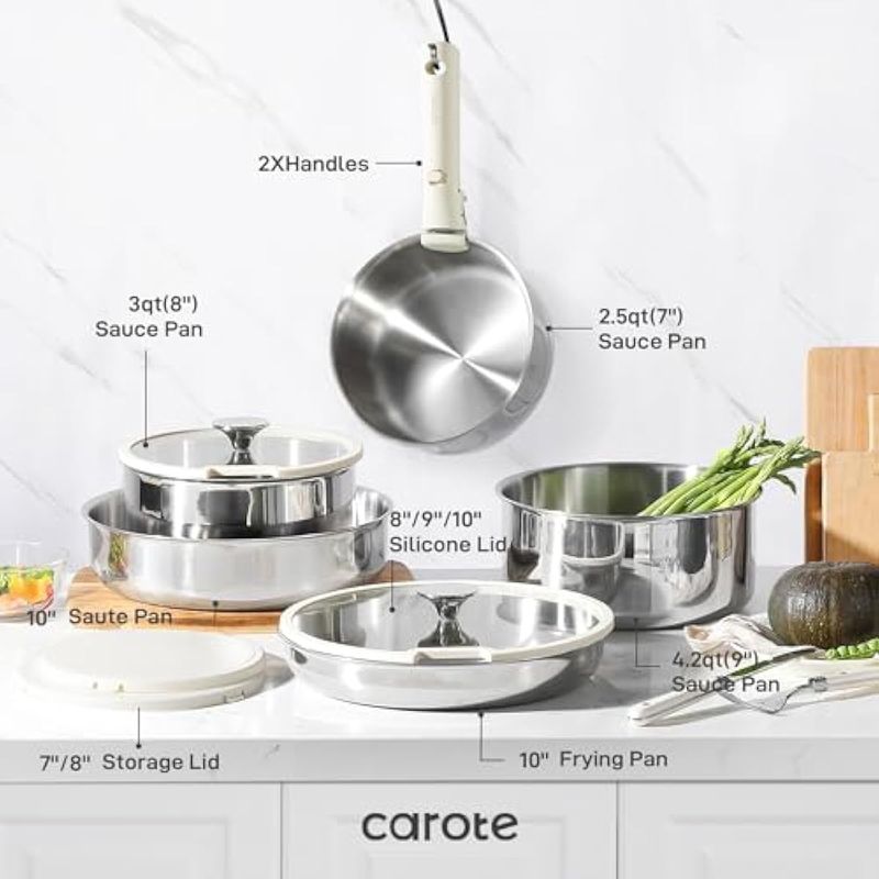 CAROTE Juego de 12 ollas y sartenes, juego de utensilios de cocina de acero inoxidable, mango