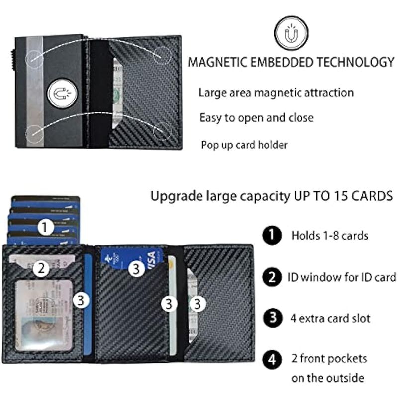 ???Capacidad para 15 tarjetas y ventana de identificación visible? - Cartera minimalista para hombres con carcasa de metal con capacidad para 1 a 8 tarjetas. Soporte para tarjetas de crédito para hombres. En el interior hay 5 ranuras adicionales para tarjetas y 2 ranuras externas para tarjetas bolsillo delantero.