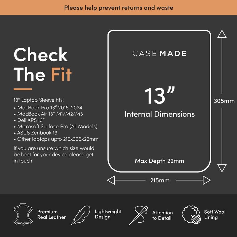 CASEMADE FUNDA DE PIEL AUTéNTICA PARA LAPTOP MACBOOK PRO Y AIR DE 13, 14, 15 Y 16 PULGADAS, PIEL AUTéNTICA DE GRANO COMPLETO CON FORRO DE LANA SUAVE (13 PULGADAS - PRO 2016-2023, AIR M1/M2/M3)