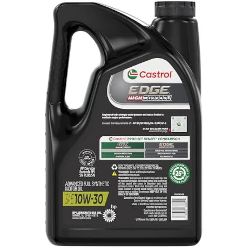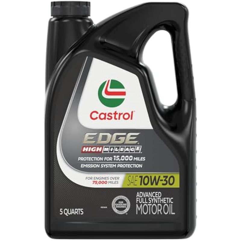 Castrol Edge de alto kilometraje para un máximo rendimiento en vehículos de 75K+ millas Castrol EDGE High Mileage es parte de nuestra gama más fuerte y avanzada de aceites sintéticos para motor. Está diseñado con tecnología de titanio líquido para proporcionar una resistencia superior al aceite del motor y ayudar a tu vehículo a maximizar el rendimiento. A medida que tu auto envejece, su motor puede perder rendimiento y eficiencia. El mantenimiento adecuado del vehículo es fundamental para mantener un motor más antiguo funcionando al máximo. Supera los requisitos de garantía del fabricante para aplicaciones que requieren API SN Conservación de recursos y ILSAC GF-5.