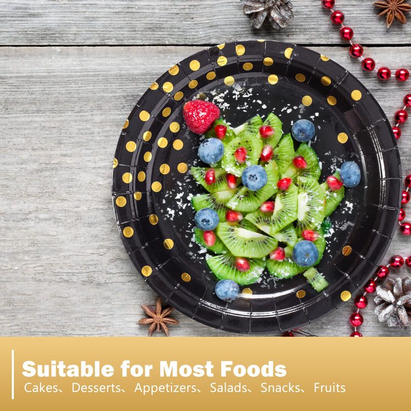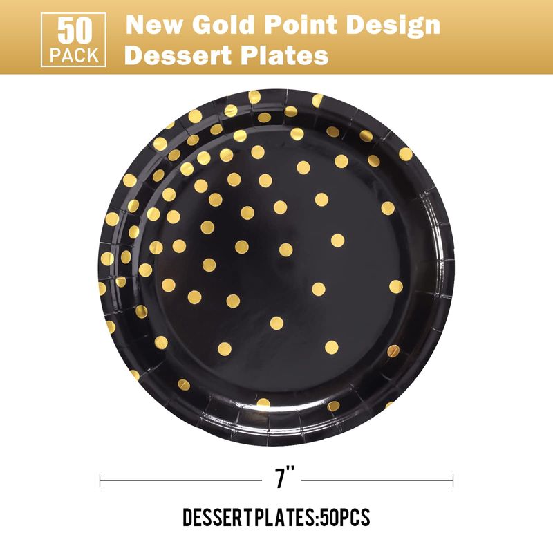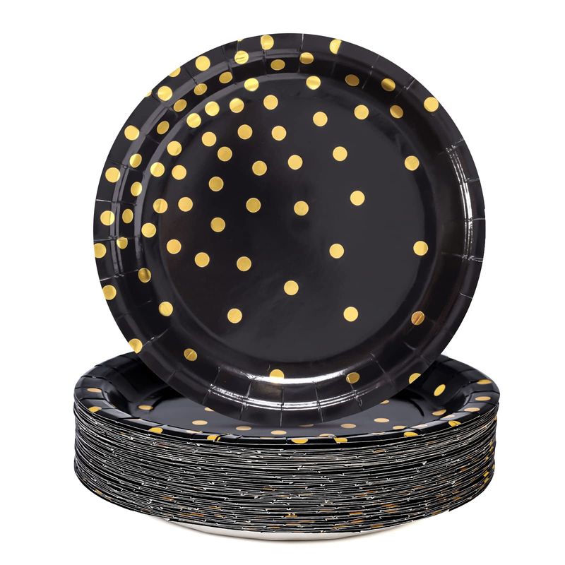 CENLBJ Platos de papel negros y dorados, 50 platos de postre desechables de puntos dorados, platos