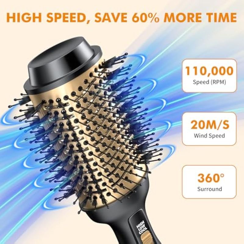 Potente motor de alta velocidad, ahorra un 60 de tiempo: este secador de cepillo redondo está equipado con un motor profesional sin escobillas que alcanza velocidades de 110,000 RPM, lo que permite a este peinador generar un potente flujo de aire, secando tu cabello ultrarrápido, ahorrando tiempo; dejando tu cabello suave, sin encrespamiento y brillante. Fácil de lograr reventones de calidad de salón en casa