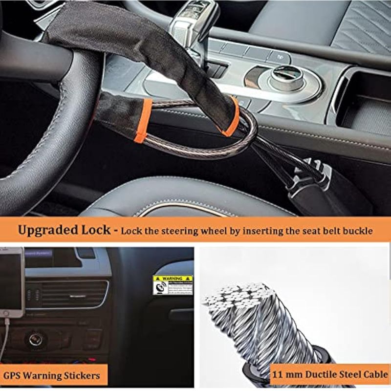 CERRADURA DE CINTURóN DE SEGURIDAD PARA VOLANTE DE AUTOMóVIL CON 4 CALCOMANíAS DE SEGUIMIENTO GPS, DISPOSITIVO ANTIRROBO DE SEGURIDAD RESISTENTE PARA AUTOMóVIL, DISPOSITIVO ANTIRROBO DE BLOQUEO DEL VOLANTE + 2 LLAVES, AJUSTE UNIVERSAL PARA CAMIONES/SUV/VAN (NEGRO)
