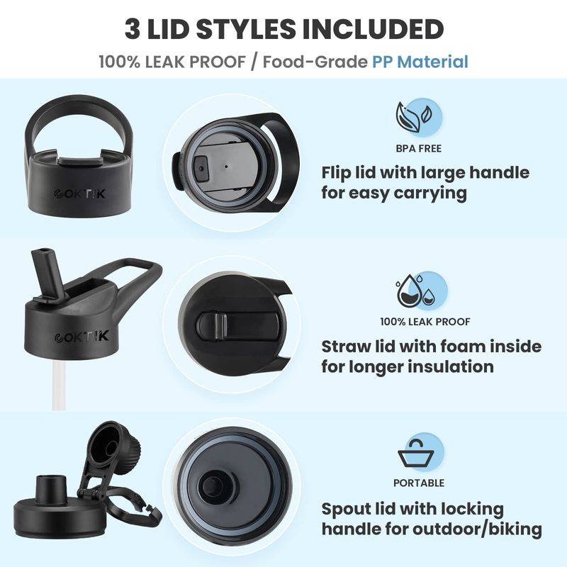 Lista de artículos incluidos en el producto: botella de agua aislada COKTIK de 22 onzas, 3 tapas tapa abatible, tapa con popote y tapa de boquilla, 2 popotes, 1 cepillo para tazas. Garantía de por vida sin preocupaciones y servicio al cliente profesional