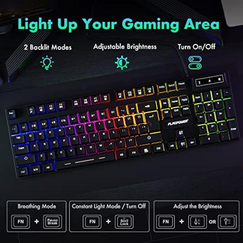 19 teclas anti-fantasma: el último teclado iluminado para juegos con 104 teclas, 19 teclas sin conflicto te permite presionar o mantener varias teclas simultáneamente sin temor a perder o pulsaciones inesperadas. El teclado y el mouse para juegos son súper receptivos, lo que podría llevarte a una atmósfera de juego bastante genial rápidamente.