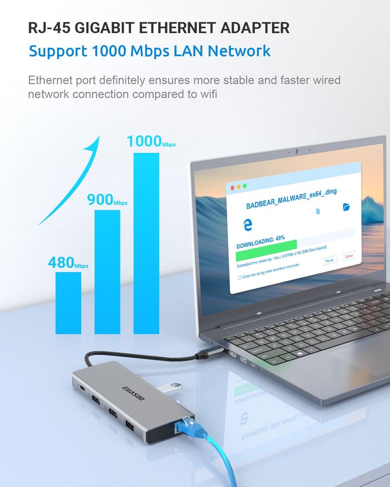 Ethernet Gigabit dual de 1000 Mbps: estación de acoplamiento de triple pantalla SUTOUG con HDMI 4K dual y puerto Gigabit Ethernet de 1000 Mbps integrado en puertos Gigabit Ethernet de 1000 Mbps, ofrece una conexión de red rápida, estable y confiable para transferir archivos grandes, videos y transmitir videos 4K.