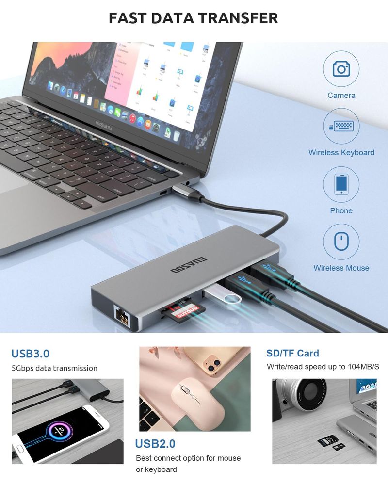 HDMI 4K y Gigabit Ethernet: estación de acoplamiento SUTOUG con puertos HDMI 4K duales admite salida de video 4K a 30Hz, compatible con iMac Pro, Dell XPS 15, HP Spectre, Lenovo Yoga, Chromebook Pixel, etc. El puerto Gigabit Ethernet integrado ofrece una conexión de red estable y rápida.