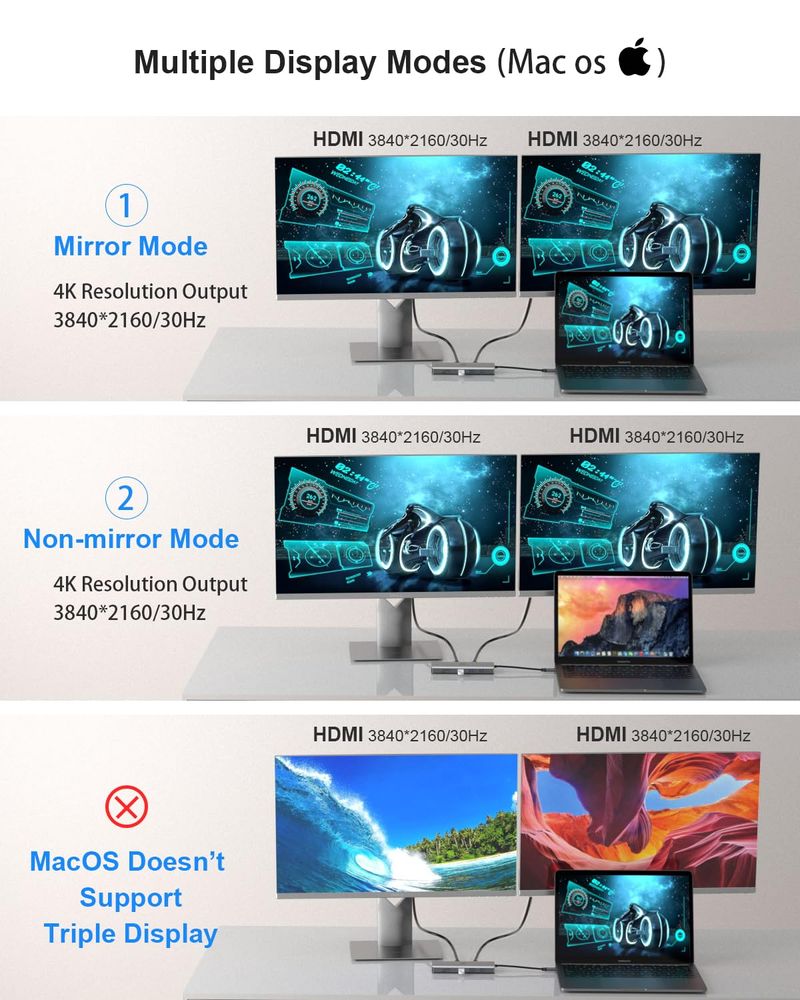 Plug and Play: No se necesitan software ni controladores adicionales. Simplemente conecte la estación de acoplamiento a su computadora y los múltiples puertos de pantalla se reconocerán automáticamente. Tenga en cuenta que la base está diseñada solo para el sistema MacOS.