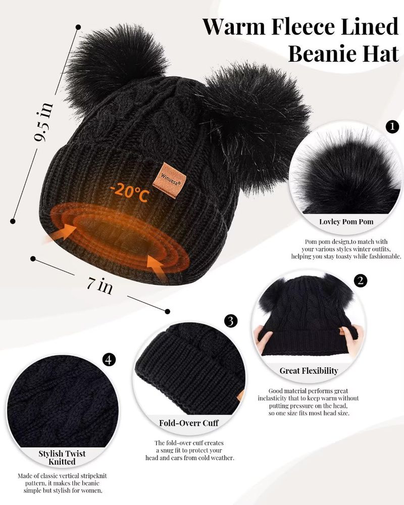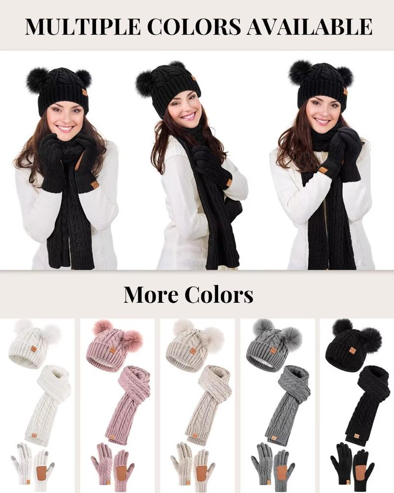 Conjunto de gorro, bufanda y guantes de invierno para mujer, gorro con forro polar con doble pompón,