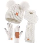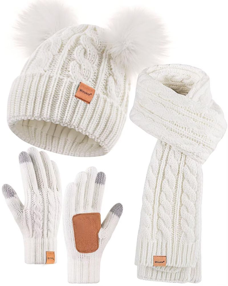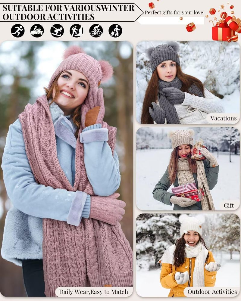 HOGARINDUMENTARIA Y ACCESORIOSConjunto de gorro, bufanda y guantes de invierno para mujer, gorro con forro polar con doble pompón,