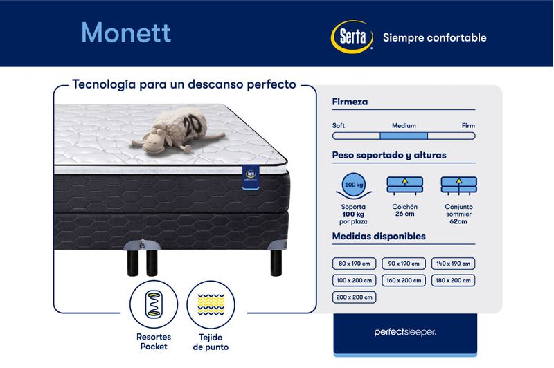 Conjunto Sommier y Colchón de resortes Serta Monett Pocket de 1 plaza 80x190 cm