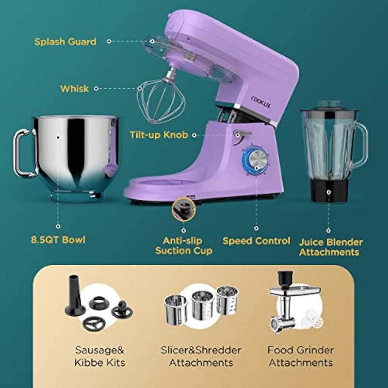COOKLEE BATIDORA DE PIE 6 EN 1, 8.5 CUARTOS DE GALóN, MEZCLADOR ELéCTRICO MULTIFUNCIONAL DE COCINA CON 9 ACCESORIOS PARA LA MAYORíA DE COCINEROS CASEROS, SM-1507BM, LAVANDA