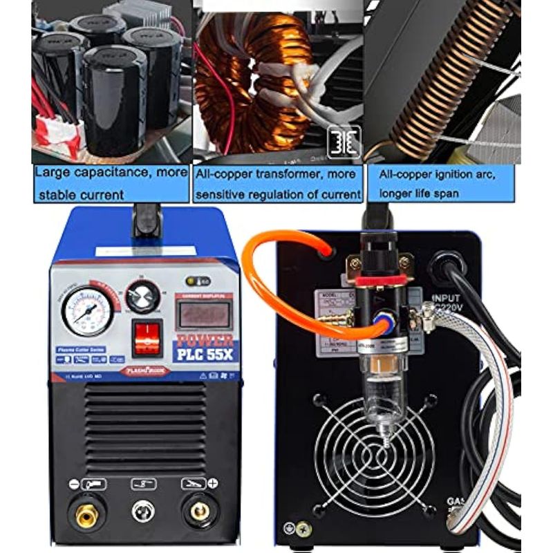 Cortador de plasma de 55 amperios: corriente de salida máxima PLC55X 55A; doble voltaje 110 V220 V ± 15 ; frecuencia dual 5060 HZ; máximo 12 pulgadas de corte limpio; cuando la presión del aire está entre 60 psi - 70 psi, se logran mejores resultados de corte.