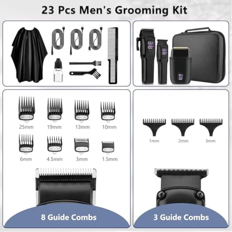 Kit de cortadora y recortadora de veintitrés piezas para hombre: nuestro kit de corte de pelo incluía una gran caja de almacenamiento de EVA, aceite lubricante, peine de barbero, capa de barbero, dos cepillos de limpieza, tres líneas de carga USB, ocho accesorios de protección de cortaúñas 1.534.561013190.984 in y tres peines guía 120.118 in para recortadora de contorno t. Este es un kit de peluquero completo, adecuado tanto para barberos profesionales como para uso doméstico