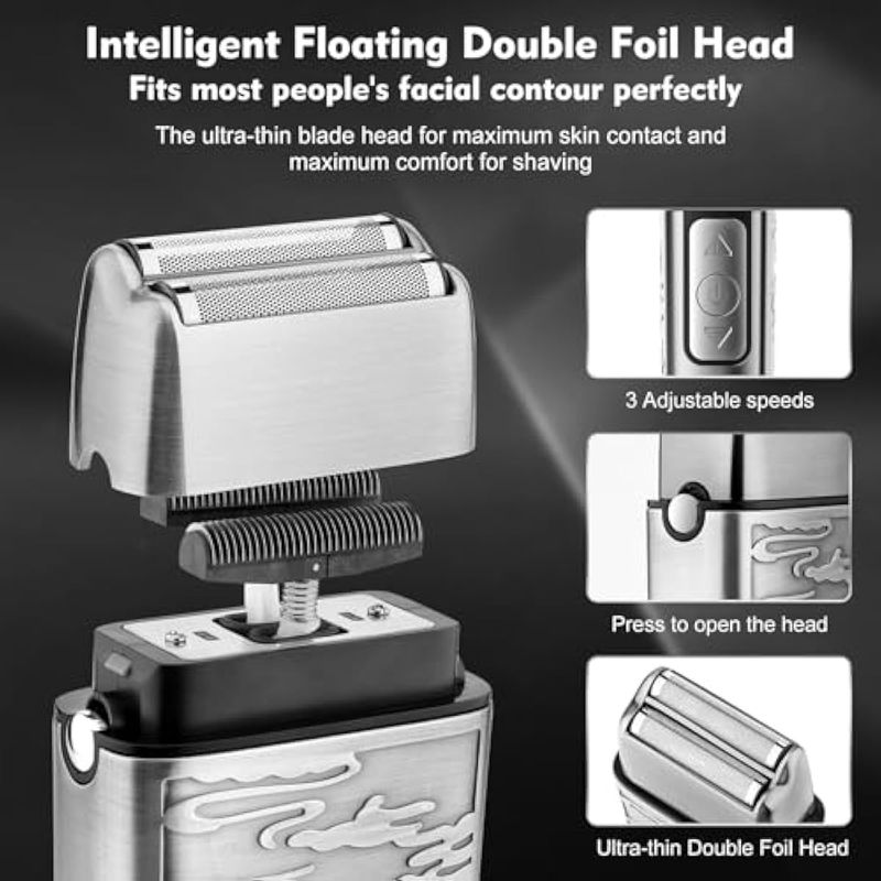 Cabezal flotante inteligente de doble aluminio: la maquinilla de afeitar eléctrica viene con un cabezal de afeitado inteligente de doble flotación con malla de hoja fina y suave que sigue de cerca los contornos de la cara, con un ajuste de cambio de tres velocidades, te ofrece un afeitado cómodo y rápido. Afeitadoras eléctricas de cuerpo completo con diseño impermeable IPX6. Puedes enjuagar directamente debajo del grifo para facilitar la limpieza.