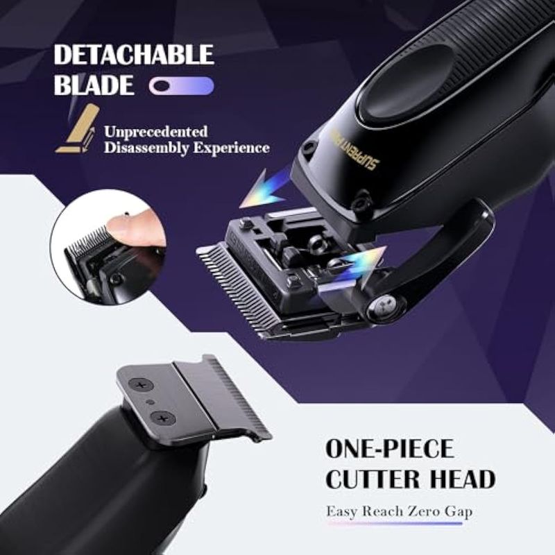 Cabezal de corte desmontable de una sola pieza sin huecos: la cortadora de pelo SUPRENT tiene un diseño de cabezal de corte desmontable integrado que puede ajustar fácilmente el espacio cero tanto para la cortadora como para la recortadora, lo que te da una nueva experiencia de desmontaje y montaje. Al tiempo que garantiza la nitidez y la durabilidad, que puede reducir eficazmente la temperatura de la hoja en un 20. Además, la hoja ajustable 0.020-0.079 in te da el gradiente y la suavidad para perseguir lo último en detalle.