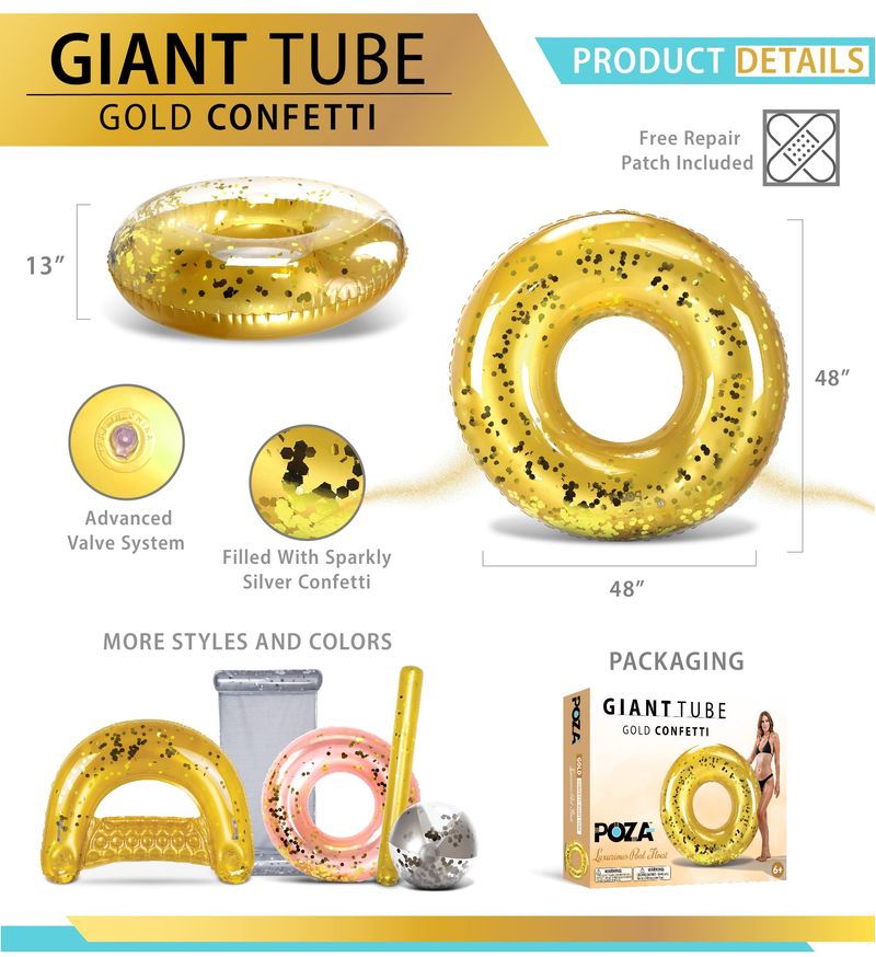 Incluido con la compra de flotador de piscina de oro rosa: incluye 1 flotador de piscina de oro rosa POZA para niños y adultos relleno de confeti dorado diseñado con un color oro rosa. Utiliza una bomba de aire eléctrica con nuestro avanzado sistema de válvula de aire rápido para inflar o desinflar fácilmente el tubo de purpurina del flotador de piscina. El anillo flotante inflable para niños y adultos mide 48 pulgadas de largo x 48 pulgadas de ancho x 13 pulgadas de alto e incluye un parche de reparación. Tubos recomendados para edades de 4 años en adelante.