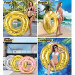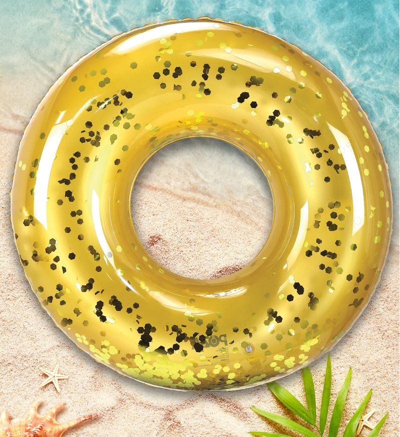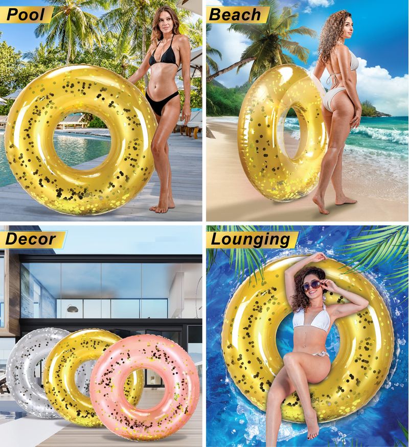 El anillo inflable de piscina de oro rosa es para cualquier persona a la que le encanta descansar con estilo. ¿Buscas decorar un espacio al aire libre para una fiesta temática de playa? El elegante anillo flotante de piscina es imprescindible en la lista de deseos de verano de la que no puedes prescindir. El flotador inflable con anillo de oro rosa relleno de confeti dorado brillante hace un momento mágico bajo el sol. El telón de fondo perfecto para fiestas en la piscina y flotadores de verano para adultos y niños que buscan causar un chapoteo.
