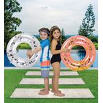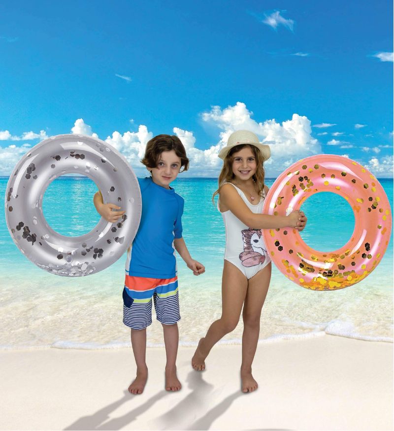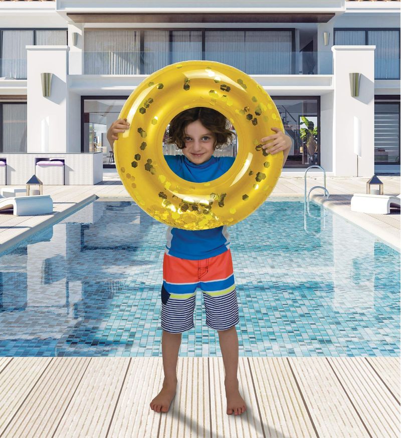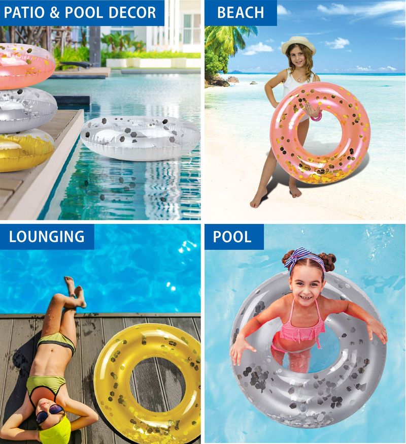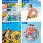 El anillo inflable de piscina de oro rosa es para cualquier persona a la que le encanta descansar con estilo. ¿Buscas decorar un espacio al aire libre para una fiesta temática de playa? El elegante anillo flotante de piscina es imprescindible en la lista de deseos de verano de la que no puedes prescindir. El flotador inflable con anillo de oro rosa relleno de confeti dorado brillante hace un momento mágico bajo el sol. El telón de fondo perfecto para fiestas en la piscina y flotadores de verano para adultos y niños que buscan causar un chapoteo.