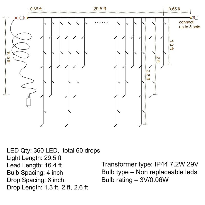 Encantadoras luces de Navidad para exteriores: Dazzle Bright - Las luces de Navidad al aire libre miden 29.5 pies de largo. El cable de plomo es de 16.5 pies, el espacio entre bombillas es de 4 pulgadas. La longitud total es de 45 pies. Hay 3 longitudes de caída diferentes: 1.3 pies, 2 pies, 2.6 pies, y el espacio entre cada línea de caída es de 6 pulgadas.