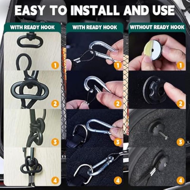 Red de carga de malla fácil de instalar: la red de almacenamiento de carga se puede fijar a los puntos de montaje en la zona de carga trasera con 4 ganchos autobloqueantes. Todos los accesorios necesarios están incluidos en el paquete, por lo que puede montarlos rápida y fácilmente, sin necesidad de otras herramientas especiales. Si tienes alguna pregunta sobre el tamaño de la red de carga DEDC para automóvil, no dudes en ponerte en contacto con nosotros antes de comprar