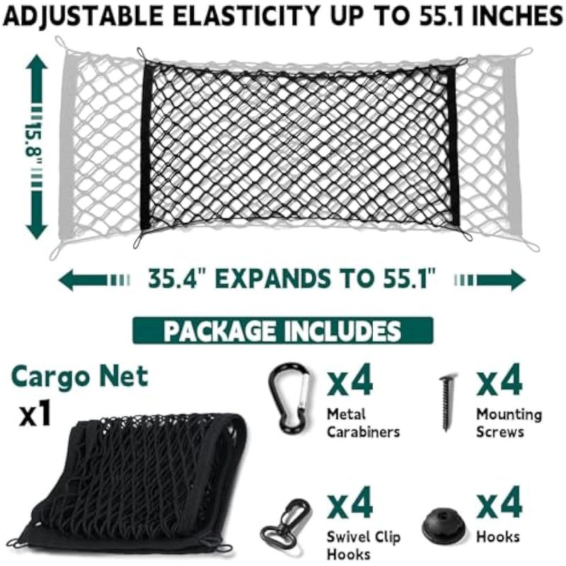 ?Maletero de gran capacidad?La red de carga para maletero de automóvil tiene elasticidad y elasticidad, el tamaño máximo elástico es de 55.1 x 15.8 pulgadas, el tamaño relajado es de 35.4 x 15.8 pulgadas. Puedes estirarlo al tamaño adecuado de acuerdo a tus necesidades. Incluye 1 red de almacenamiento de carga, 4 ganchos, 4 mosquetones y 4 clips giratorios, y 4 piezas del juego. Nota: Confirme el tamaño de su coche antes de comprar
