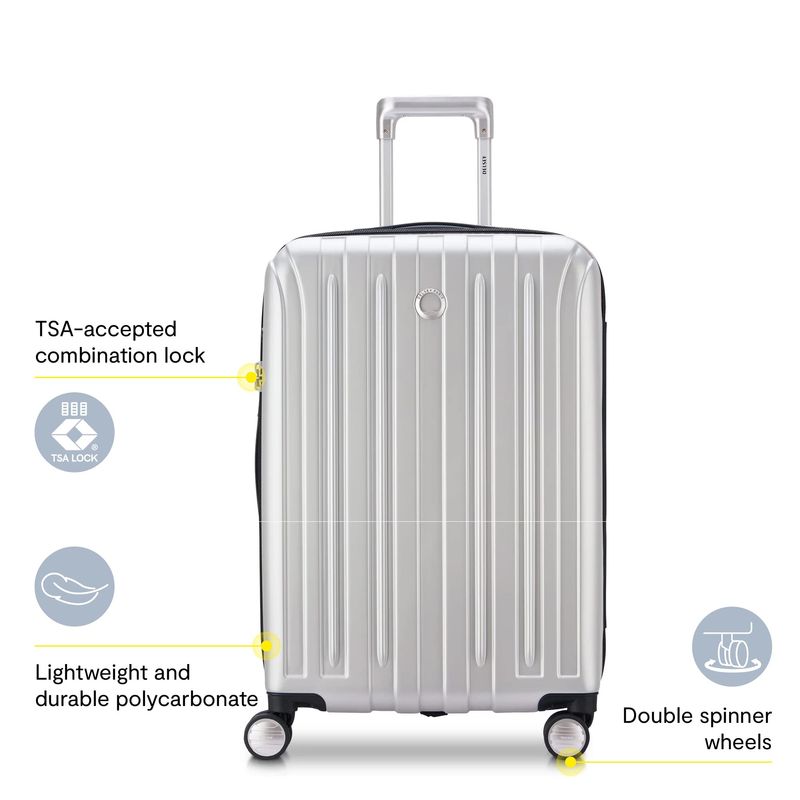 El equipaje giratorio expansible internacional es parte de la colección Delsey Helium Titanium.