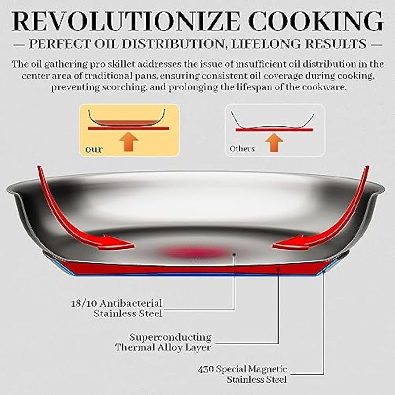 Elegante y funcional: la sartén de acero inoxidable Oil Gather Pro combina perfectamente un diseño refinado con excelentes capacidades de cocción. Su acabado pulido y mango ergonómico complementan sin esfuerzo cualquier decoración de cocina, creando una exquisita exhibición de mesa. Esta práctica sartén es perfecta para la cocina diaria, con una generosa forma profunda, incluso calefacción, satisfaciendo todas tus necesidades culinarias