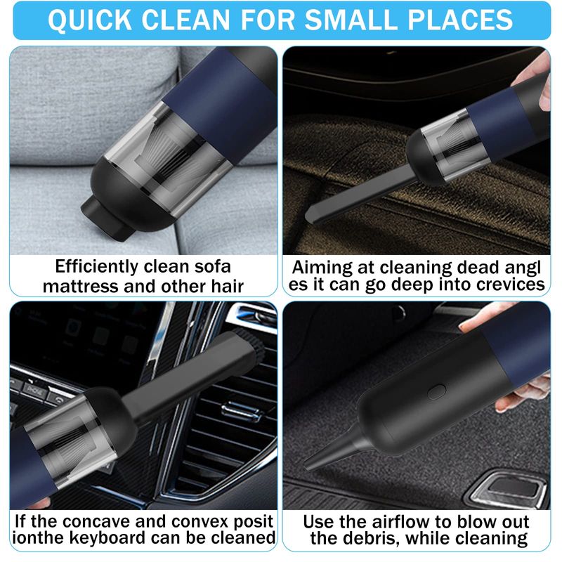 Ajuste lavable y bajo nivel de ruido: Cada polvo tiene un simple enjuague con agua y garantiza una fuerte succión, que es lavable y más duradera, no hay necesidad de reemplazarlo a menudo, tecnología avanzada de reducción de ruido, el ruido generado por la mini aspiradora es inferior a 65 dB.