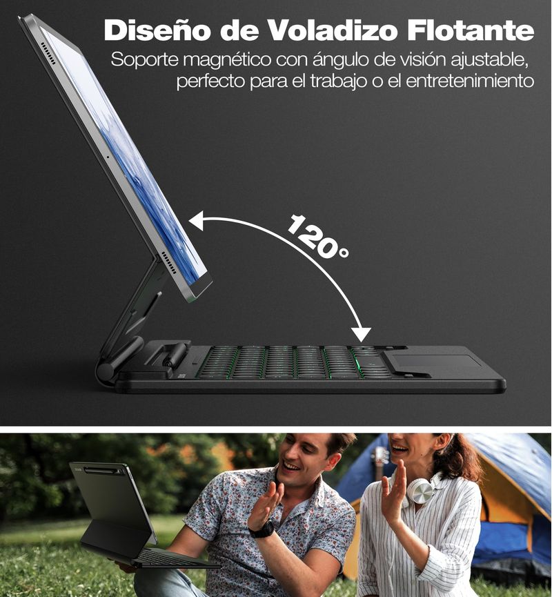 Soporte magnético de fácil configuración: la bisagra de aleación de aluminio duradera mantiene el soporte voladizo flotante firmemente en su lugar. Muchos imanes pequeños están integrados en la cubierta trasera de piel sintética, lo que le permite fijar su tableta magnéticamente y transformarla en una computadora portátil en un segundo. El soporte magnético se puede ajustar suavemente para lograr un ángulo de visión perfecto para escribir, leer y ver.