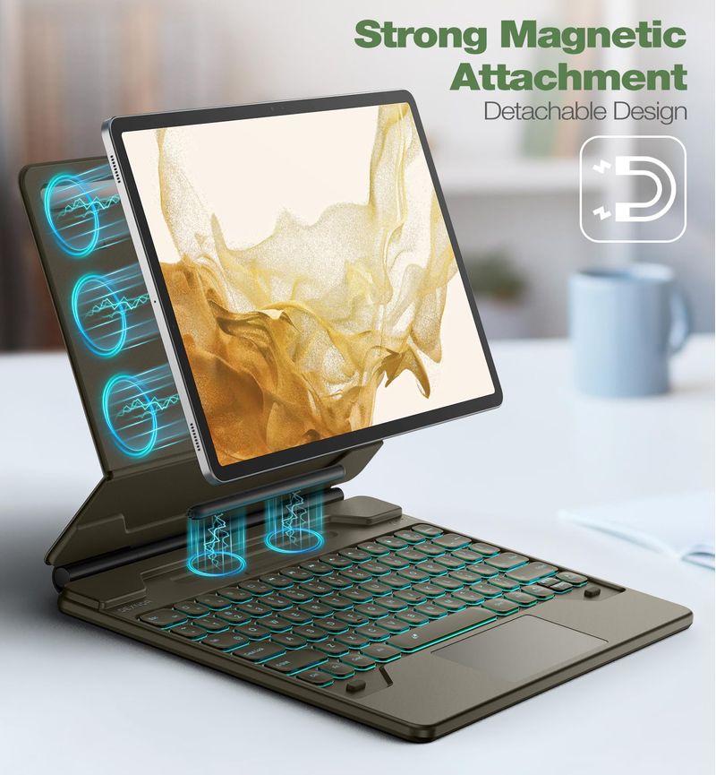 Soporte magnético de fácil configuración: la bisagra de aleación de aluminio duradera mantiene el soporte voladizo flotante firmemente en su lugar. Muchos imanes pequeños están integrados en la cubierta trasera de piel sintética, lo que le permite fijar su tableta magnéticamente y transformarla en una computadora portátil en un segundo. El soporte magnético se puede ajustar suavemente para lograr un ángulo de visión perfecto para escribir, leer y ver.