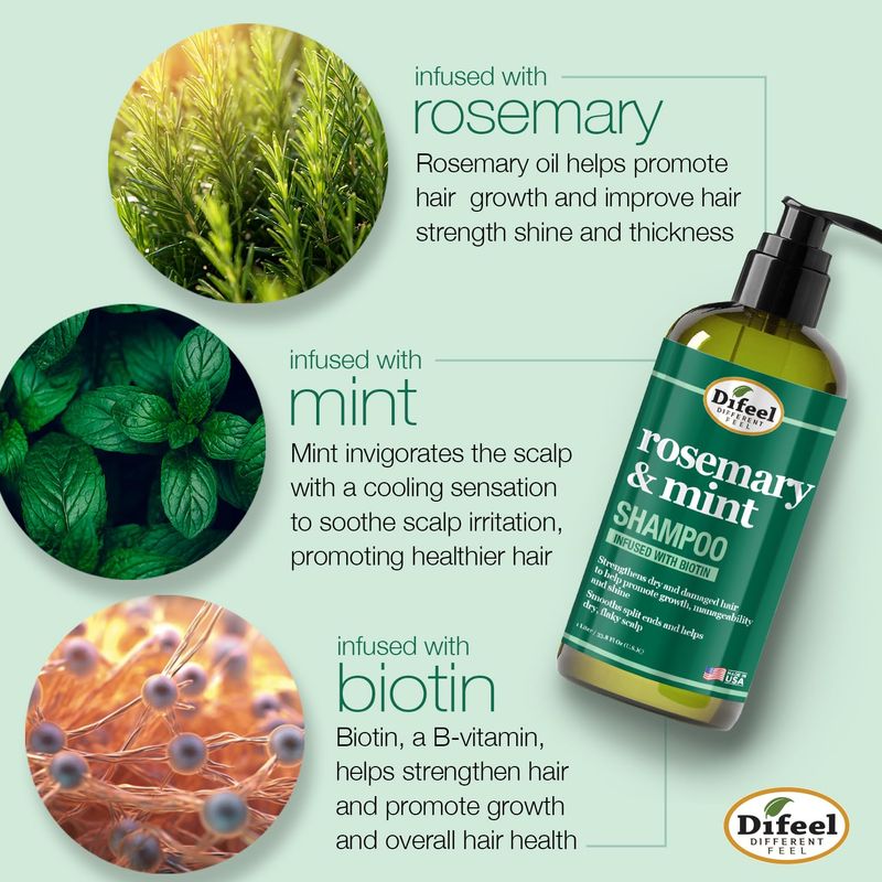 Difeel Champú fortalecedor de menta y romero con biotina, 33.8 onzas, hecho con aceite de romero