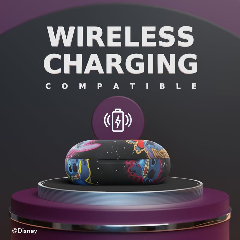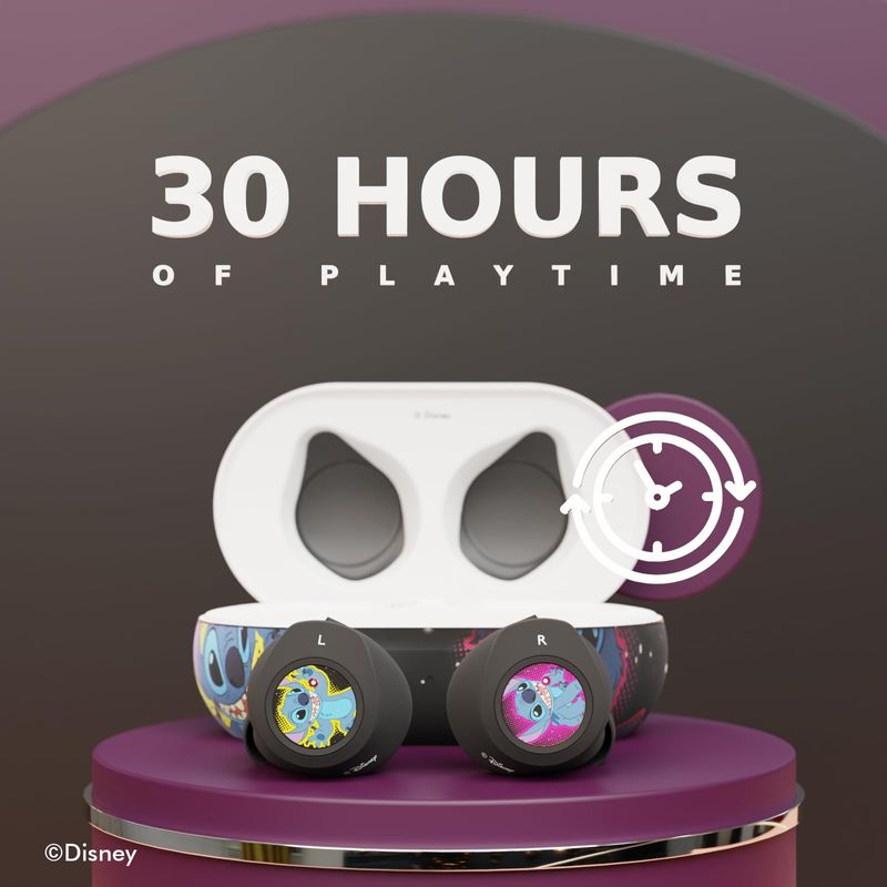 Características: Reproduce o pausa fácilmente tus canciones favoritas de Disney, salta a la pista siguiente o anterior, ajusta el volumen, responde o rechaza llamadas telefónicas y cuelga, todo con un simple toque. Hasta 30 horas de reproducción con una sola carga con nuestro estuche de carga integrado y una distancia de conexión inalámbrica de 33 pies.