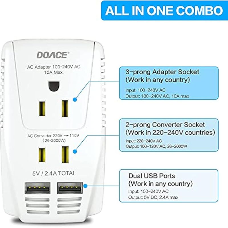 DOACE C11 - CONVERTIDOR DE VOLTAJE DE VIAJE MEJORADO DE 2000 W PARA SECADOR DE PELO, ALISADOR DE PELO, RIZADOR, BAJAR DE 220 V A 110 V, ADAPTADOR DE CORRIENTE DE 10 A CON 2 USB Y ENCHUFES DE UE/REINO UNIDO/AU/EE. UU. PARA LAPTOP, CáMARA Y TELéFONO CELULAR