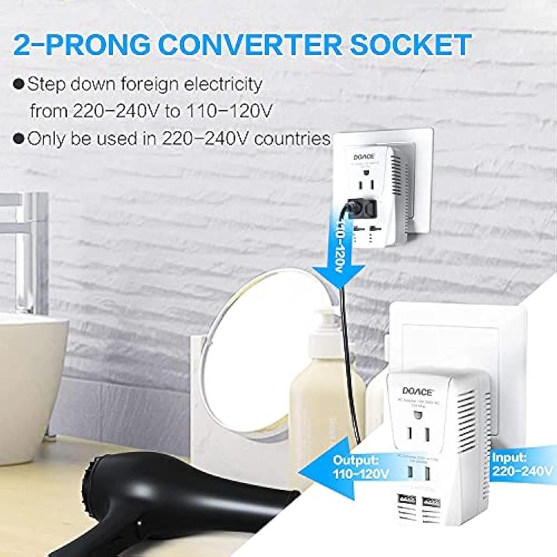 Convertidor actualizado para dispositivos de 110 V120 V: el enchufe convertidor de CA de 2 clavijas puede reducir el voltaje externo de 220 a 240 V a 110 V120 V, diseñado para dispositivos estándar de Estados Unidos cuando los estadounidenses viajan a países de 220 a 240 V, como herramientas de peinado ConairBabylissproRevlon alisador de pelo, plancha plana, rizador. plancha y secar el cabello. ers excepto Dyson, planchas de vapor, hervidor eléctrico, etc.