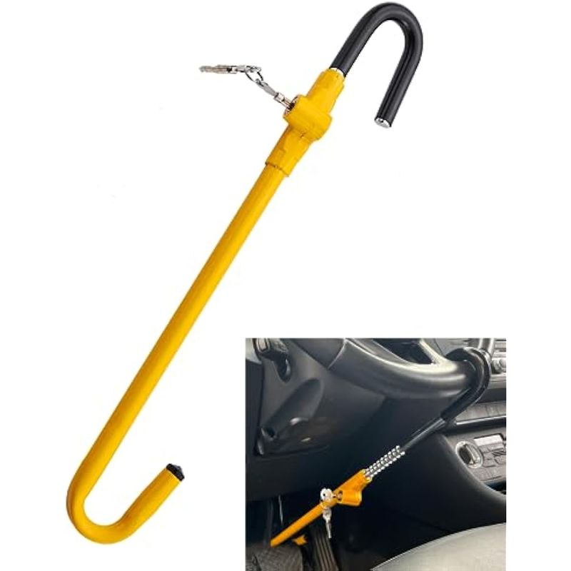 Fácil de usar: El dispositivo antirrobo para automóvil es fácil de instalar y quitar en pocos minutos y fácil de almacenar se adapta debajo de tu asiento. El bloqueo del volante se puede estirar suavemente hasta 30 pulgadas sin usar una llave, se bloquea después de estirarlo, debes utilizar una llave para reducir la longitud.