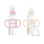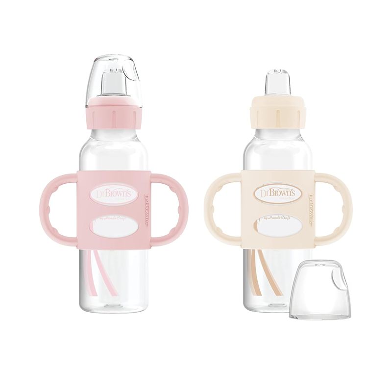 Fácil de agarrar, fácil de beber. El biberón Dr. Brown's® Milestones™ con asas de silicona es el primer paso perfecto para la transición del bebé del biberón a la taza. Introducir una boquilla para sorber nunca ha sido más simple. La boquilla de silicona suave se utiliza en lugar de la tetina en el biberón Dr. Brown's que ya es familiar para el bebé. Las asas de silicona 100 flexibles de fácil agarre son extraíbles y se adaptan a la mayoría de botellas estrechas, mientras que la tapa a presión mantiene la boquilla limpia cuando estás en movimiento. La boquilla suave se adapta a cualquier botella estrecha Dr. Brown's® Options+™ después de quitar la ventilación interna. Todas las piezas son seguras para su uso en lavavajillas solo estante superior, esterilizadores eléctricos y de microondas o agua hirviendo. 6 meses