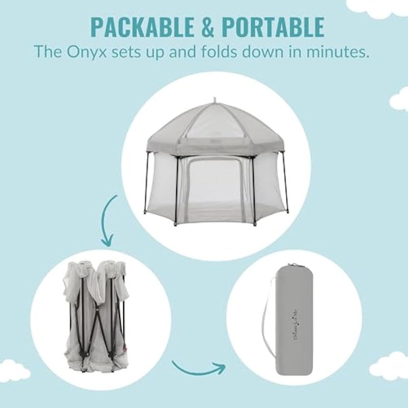 El corralito Onyx con dosel es un juego de corralito sin complicaciones en el que tu bebé puede jugar y tomar una siesta con facilidad. El marco ultraligero del Onyx lo hace ligero y portátil. La configuración tarda segundos. Se pliega y almacena de forma compacta en la bolsa de transporte proporcionada con correa, lo que lo convierte en tu compañero de viaje ideal. Úsalo en interiores, en el jardín, en la playa o en el parque. Una forma hexagonal hace que el Onyx sea súper espacioso, es lo suficientemente ancho como para acomodarte fácilmente a ti y a LO juntos. Perfecto para una historia acogedora o una sesión de juego divertida. La forma le da estabilidad, asegurando que no se derrumbe ni se vuelque. El Onyx cumple con la norma ASTM f406-17. Está fabricado con material duradero de alta calidad. Las paredes de malla transparente permiten un fácil flujo de aire y una visibilidad completa. Incluye un piso acolchado grueso, cómodo para que tu bebé juegue y tome una siesta. Utilízalo con el toldo Onyx para dar sombra a LO del sol y protegerlo de los insectos. El toldo extraíble bloquea el 98 de los dañinos rayos UVA y UVB. Las dimensiones del producto son 54 pulgadas de largo x 54 pulgadas de ancho x 30 pulgadas de alto; pesa 13.5 libras. No te preocupes por que tu bebé haga un desastre, simplemente límpialo con un paño húmedo