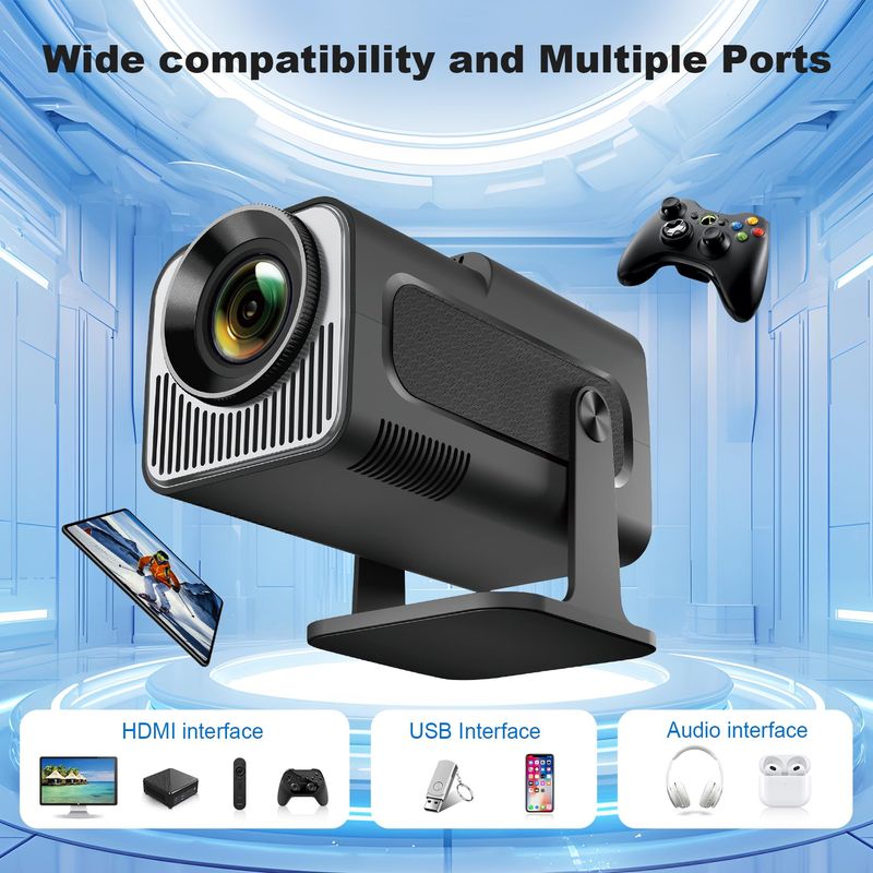 Diseño silencioso e interfaz multifunción: con un sistema de refrigeración altamente eficiente, el nivel de ruido es inferior a 25 dB, lo que garantiza un entorno de visualización silencioso mientras disfruta de impresionantes efectos visuales. Equipado con puertos HDMI, USB y audio, el proyector se puede conectar fácilmente a dispositivos externos como computadoras portátiles, memorias de TV y unidades flash USB para una compatibilidad perfecta, ampliando los límites de su entretenimiento.